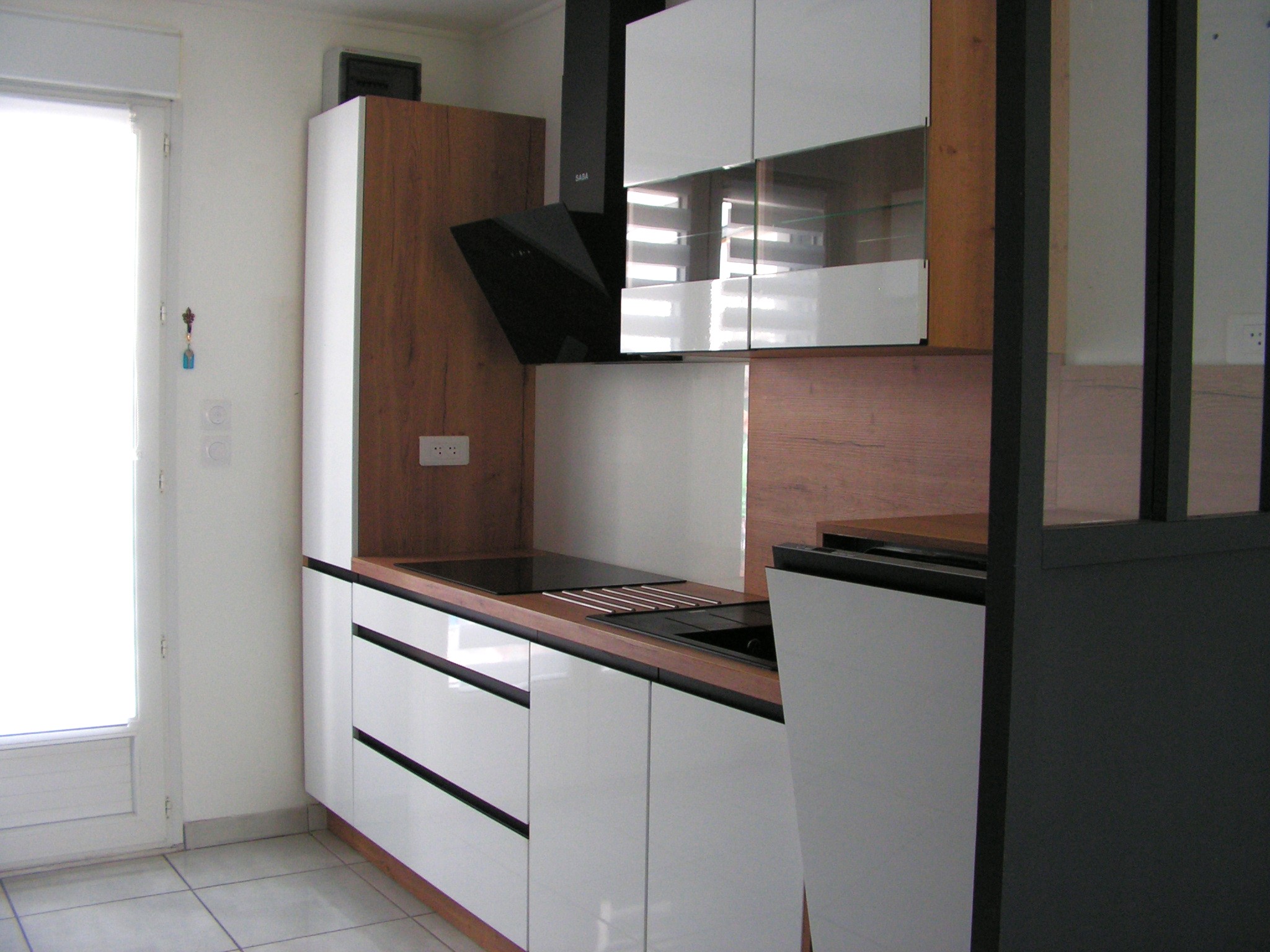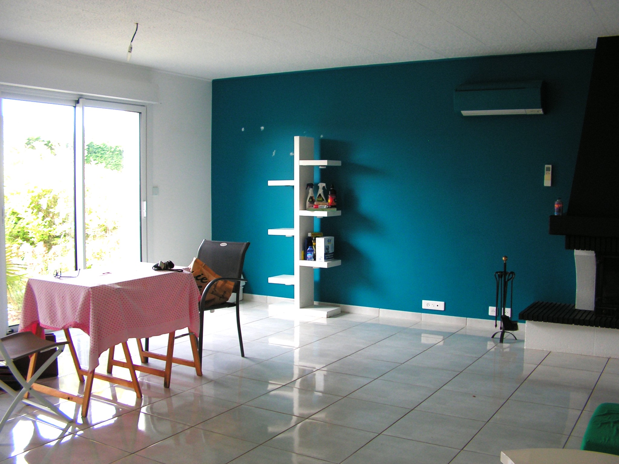 Pièce de vie avec cuisine aménagée, cheminée insert.